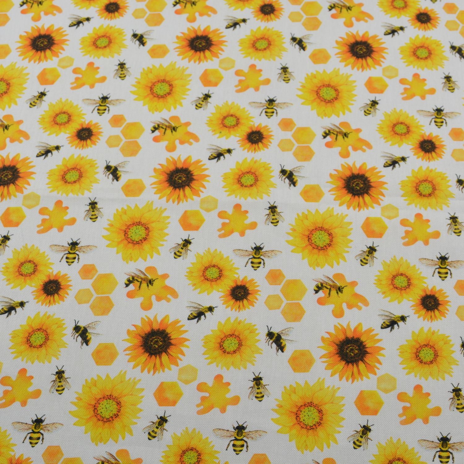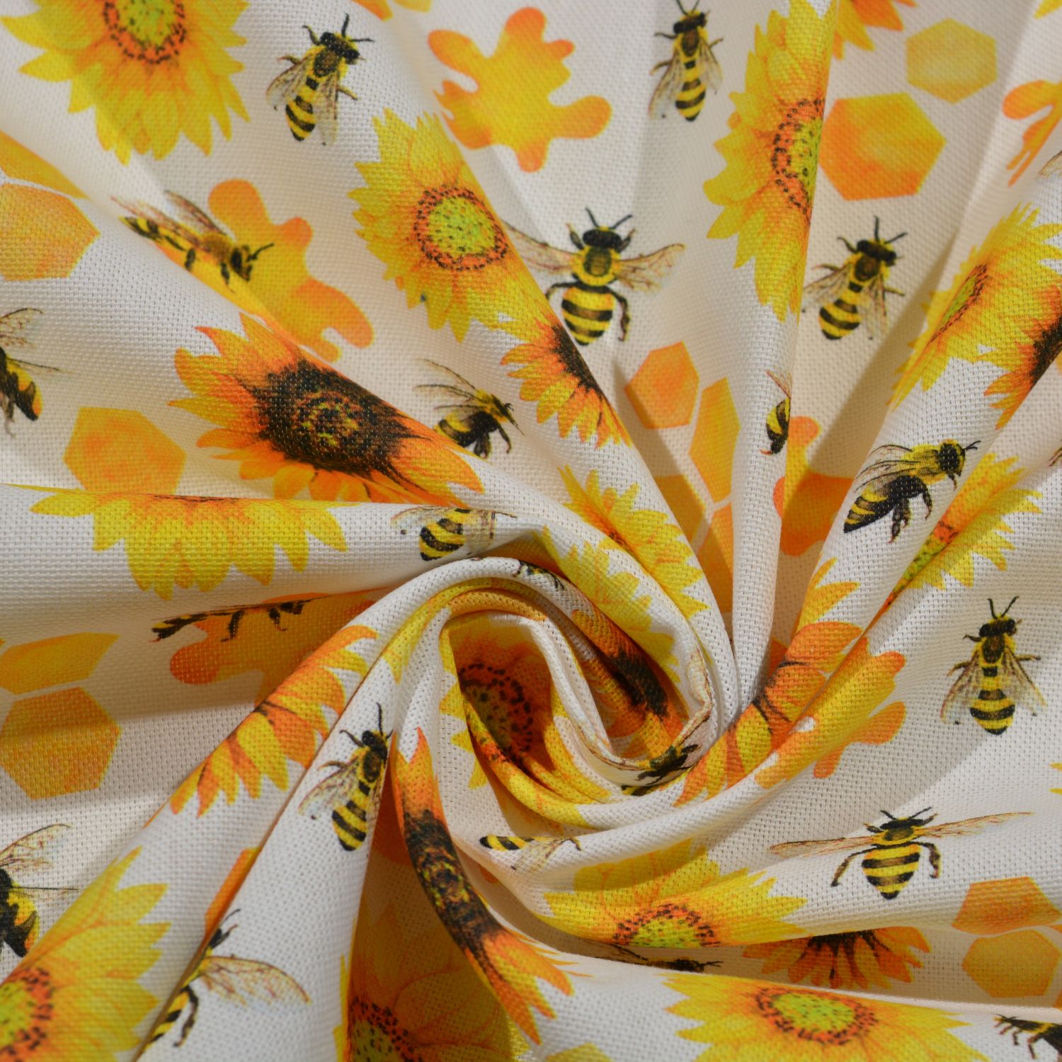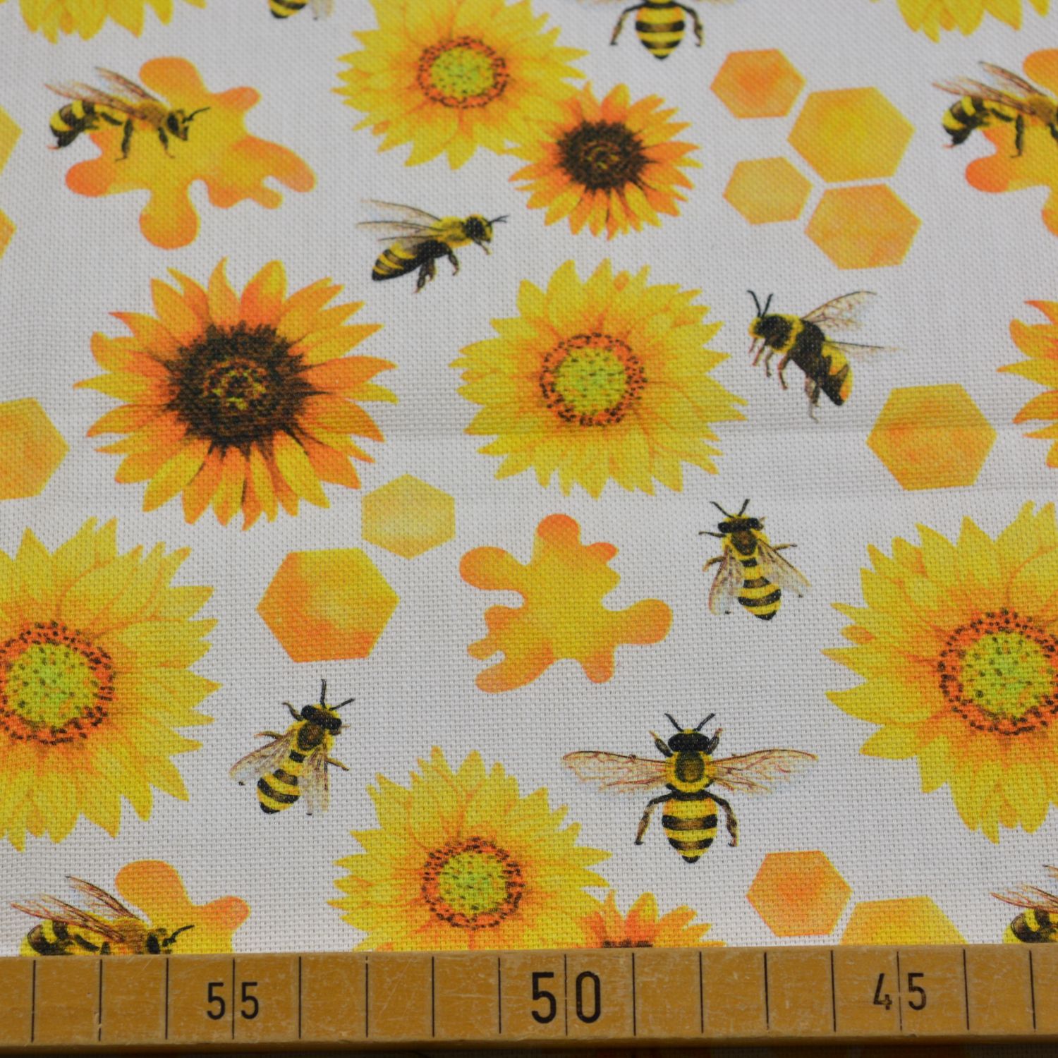 Dieser hochwertige Dekostoff aus 100 % Baumwolle überzeugt durch sein frisches, detailreiches Sonnenblumen- und Bienenmotiv. Die fein gewebte Oberfläche fühlt sich angenehm griffig an und ist gleichzeitig robust genug für vielseitige Dekorations- und Wohnprojekte. Mit einem Gewicht von ca. 120 g/m² eignet sich der Stoff ideal für leichte bis mittelschwere Anwendungen.