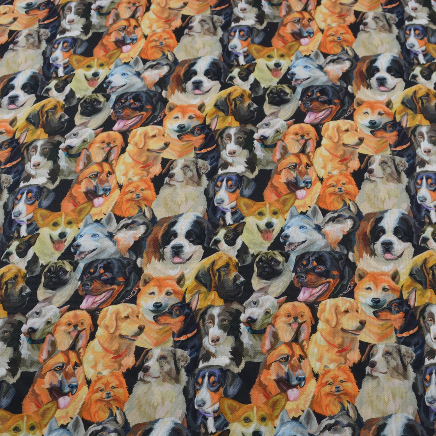 Dekostoff „Rocco“ – Hunderassen Collage auf Schwarz