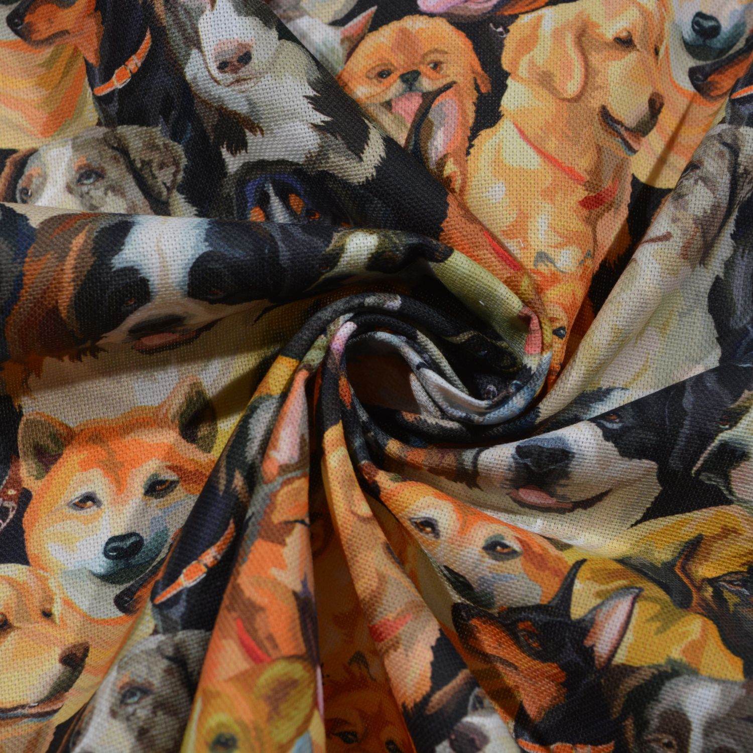 Dieser beeindruckende Dekostoff zeigt eine ausdrucksstarke Collage verschiedenster Hunderassen auf dunklem Hintergrund. Die detailreich gestalteten Hundeportraits wirken durch die kontrastreiche Farbgebung besonders intensiv und lebendig – von Golden Retriever über Husky bis hin zu Rottweiler und vielen weiteren Rassen.