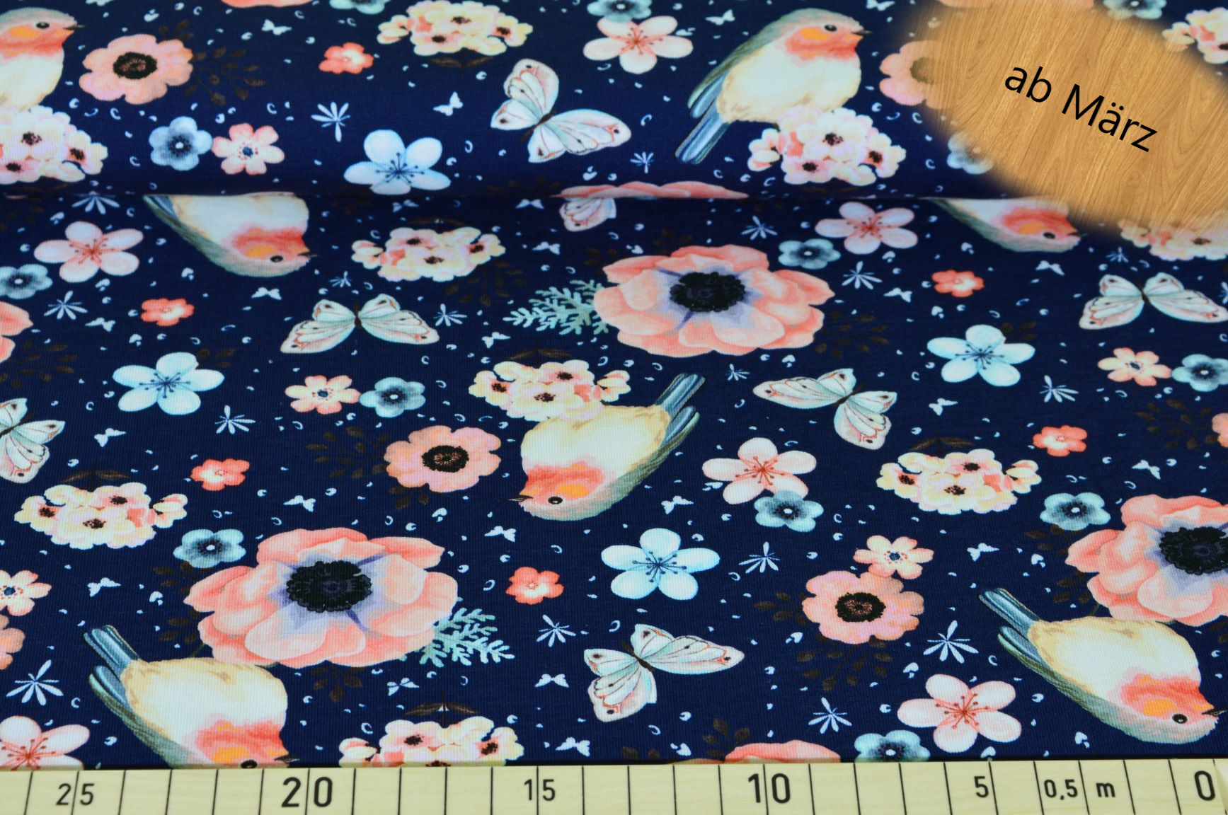Der marinefarbene Stoff ist mit charmanten Rotkehlchen und zarten Blumenmotiven bedruckt, was ihm einen romantischen und zugleich verspielten Charakter verleiht. Die kontrastreichen Farben der Vögel und Blumen heben sich wunderschön vom tiefblauen Hintergrund ab und lassen den Stoff lebendig und elegant wirken. Dieser fröhliche Print ist ideal für Projekte, die einen frischen und natürlichen Look benötigen – perfekt für die Frühlings- und Sommergarderobe.