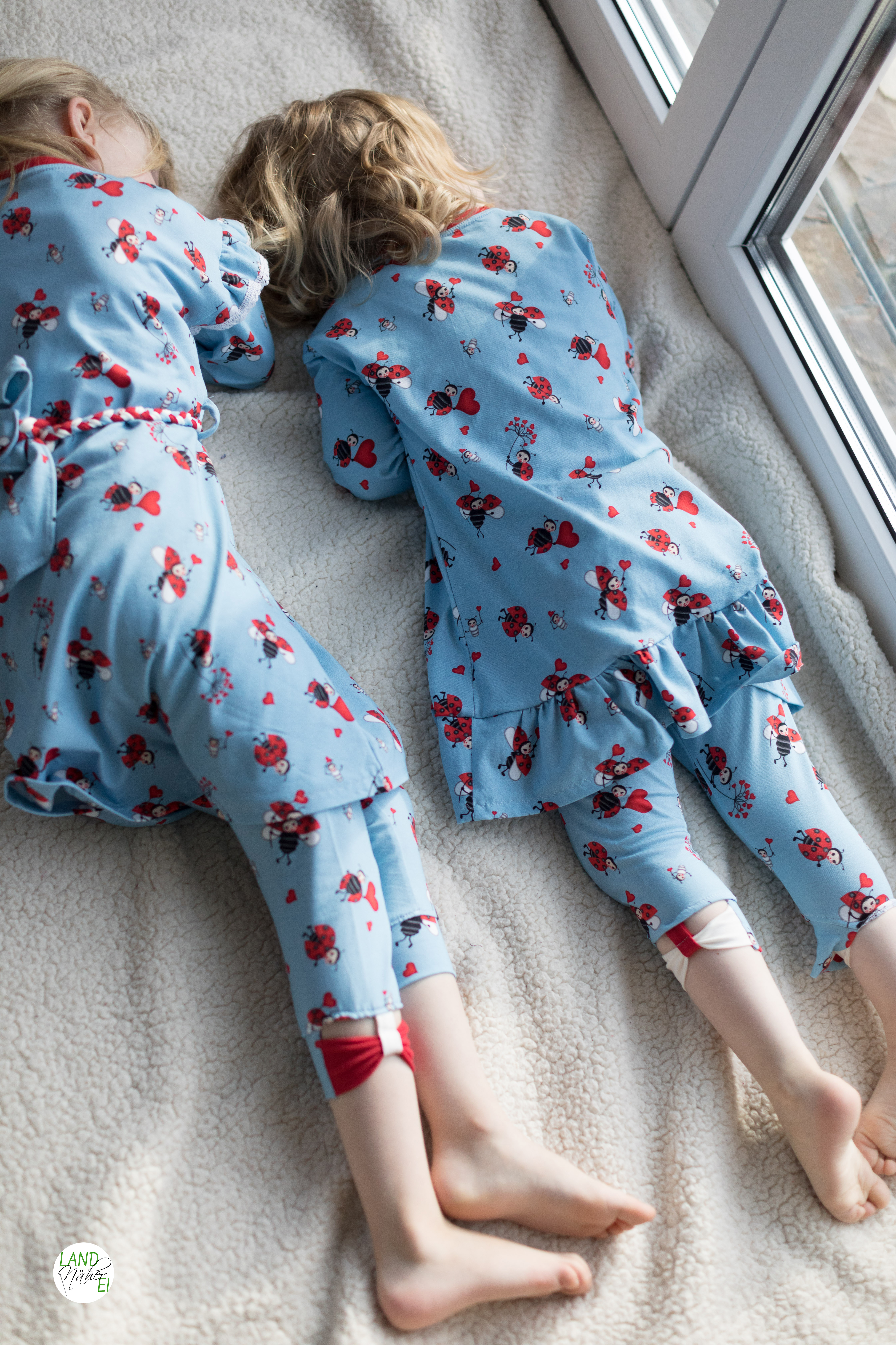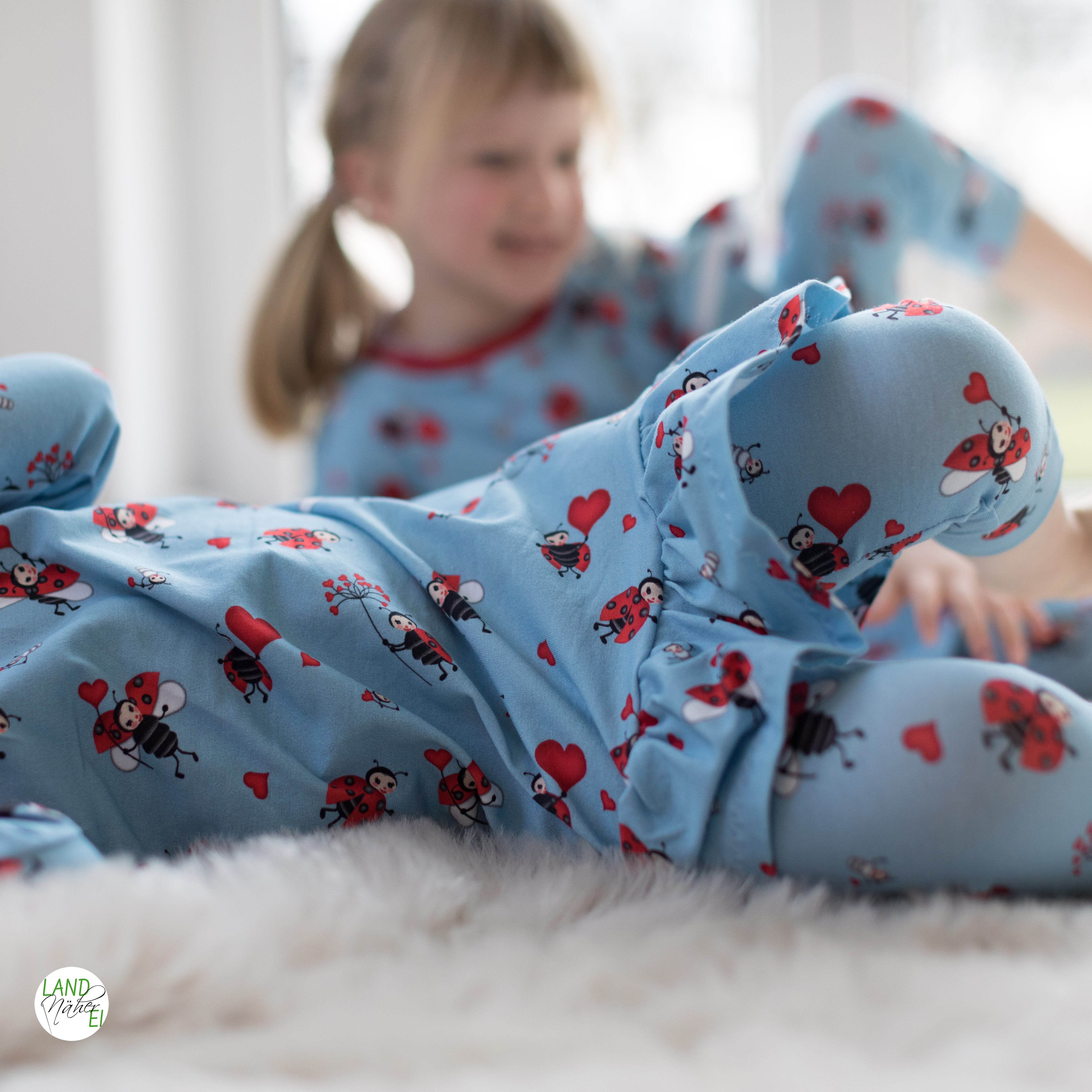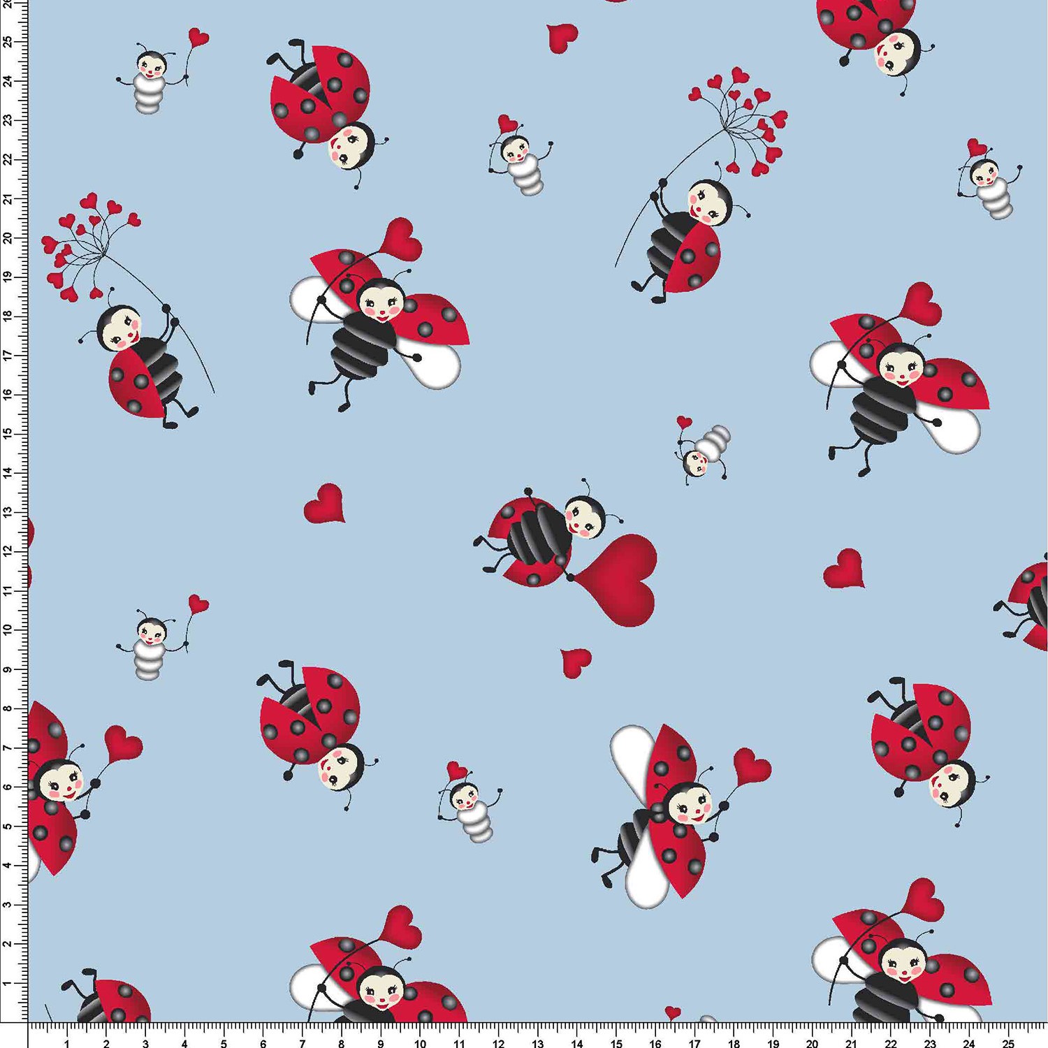 Die Oberfläche ist hellblau mit fröhlichen Marienkäfern und Herzchen bedruckt.
