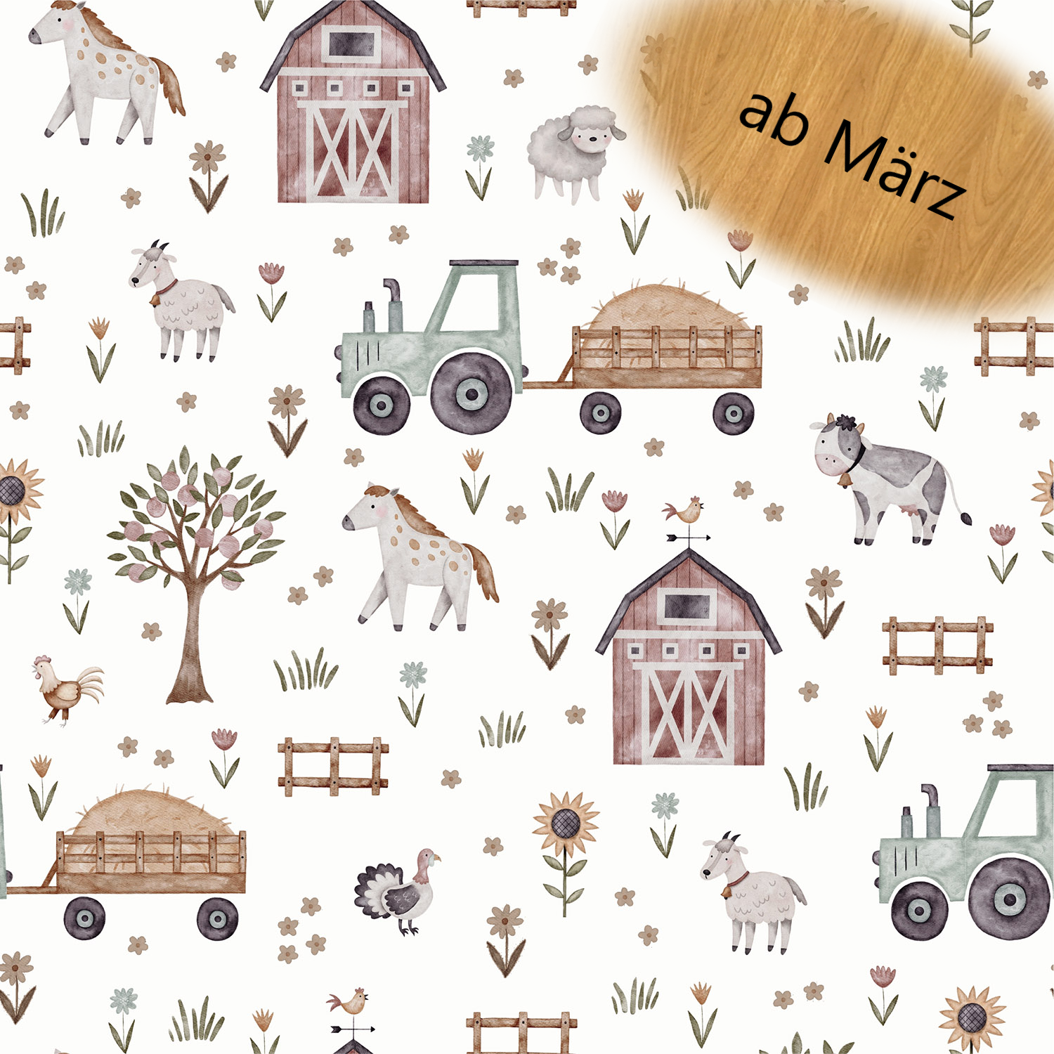 Die Oberfläche ist mit Traktoren, Blumen und Tieren auf einem weißen Untergrund bedruckt.