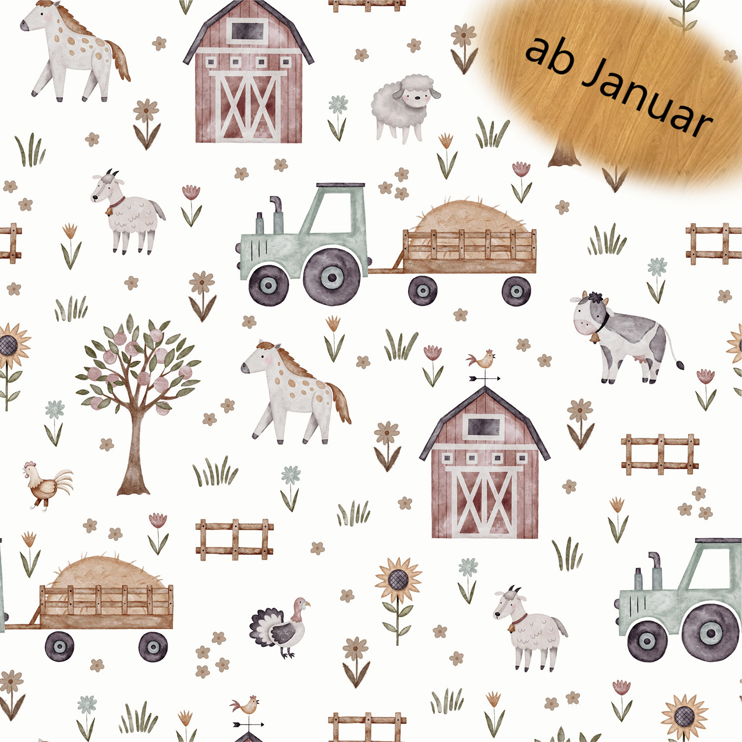 Die Oberfläche ist mit Traktoren, Blumen und Tieren auf einem weißen Untergrund bedruckt.