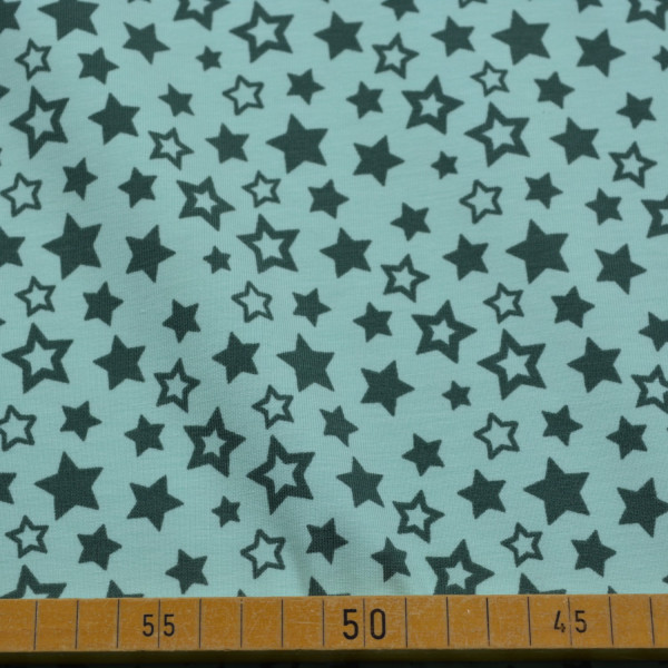 Dieser Baumwoll-Jersey präsentiert ein charmantes Muster aus kleinen, schwarzen Sternen auf einem erfrischenden mintfarbenen Hintergrund. Die hochwertige Zusammensetzung aus 95% Baumwolle und 5% Elasthan macht den Stoff weich, elastisch und äußerst angenehm zu tragen. Mit einer Breite von 150 cm und einem Gewicht von 220 g/m² ist dieser Stoff ideal für die Herstellung von T-Shirts, Kleidern, Kinderkleidung, Leggings und bequemen Freizeitoutfits. Dank seiner dezenten und zugleich verspielten Optik ist er vielseitig einsetzbar und perfekt für kreative Nähprojekte.