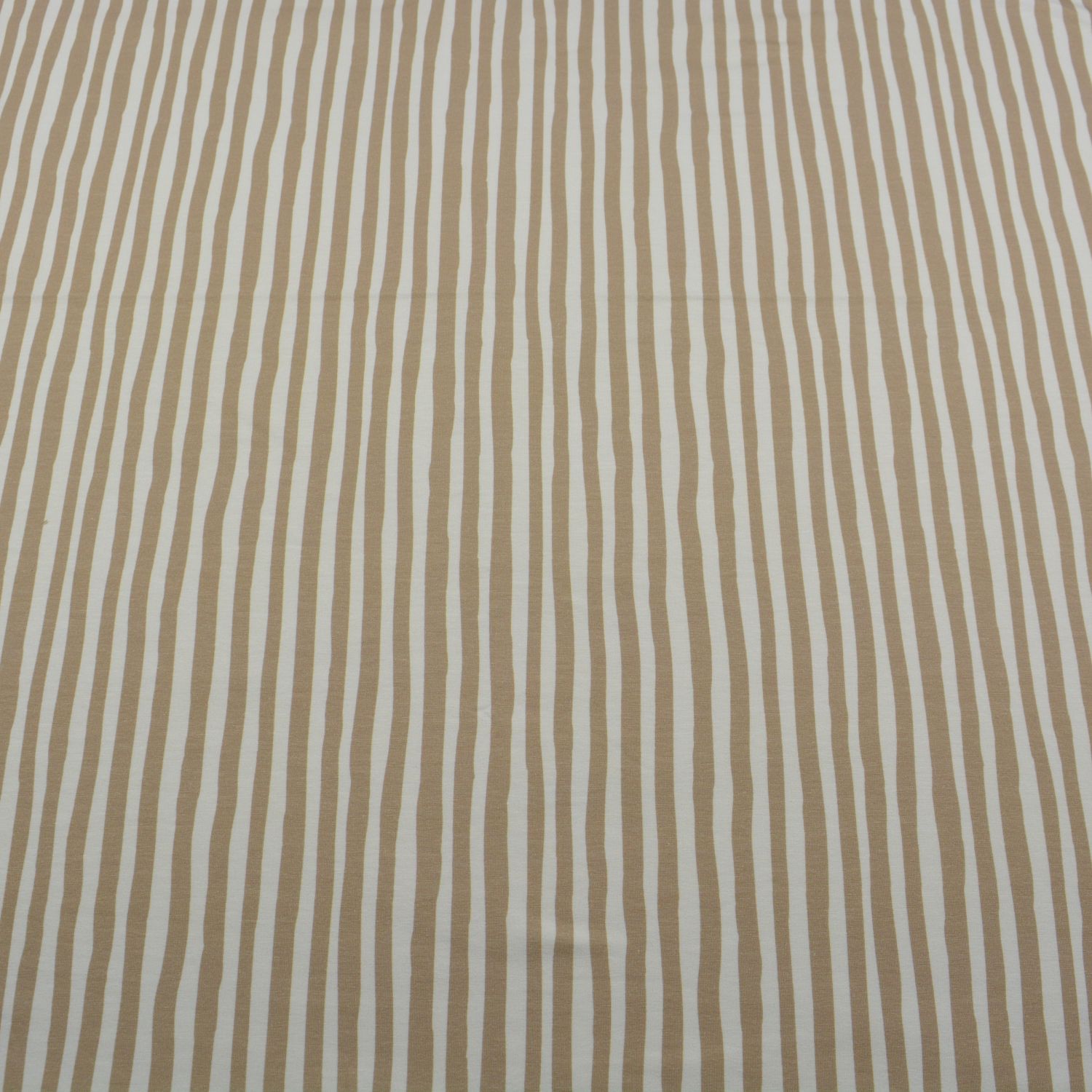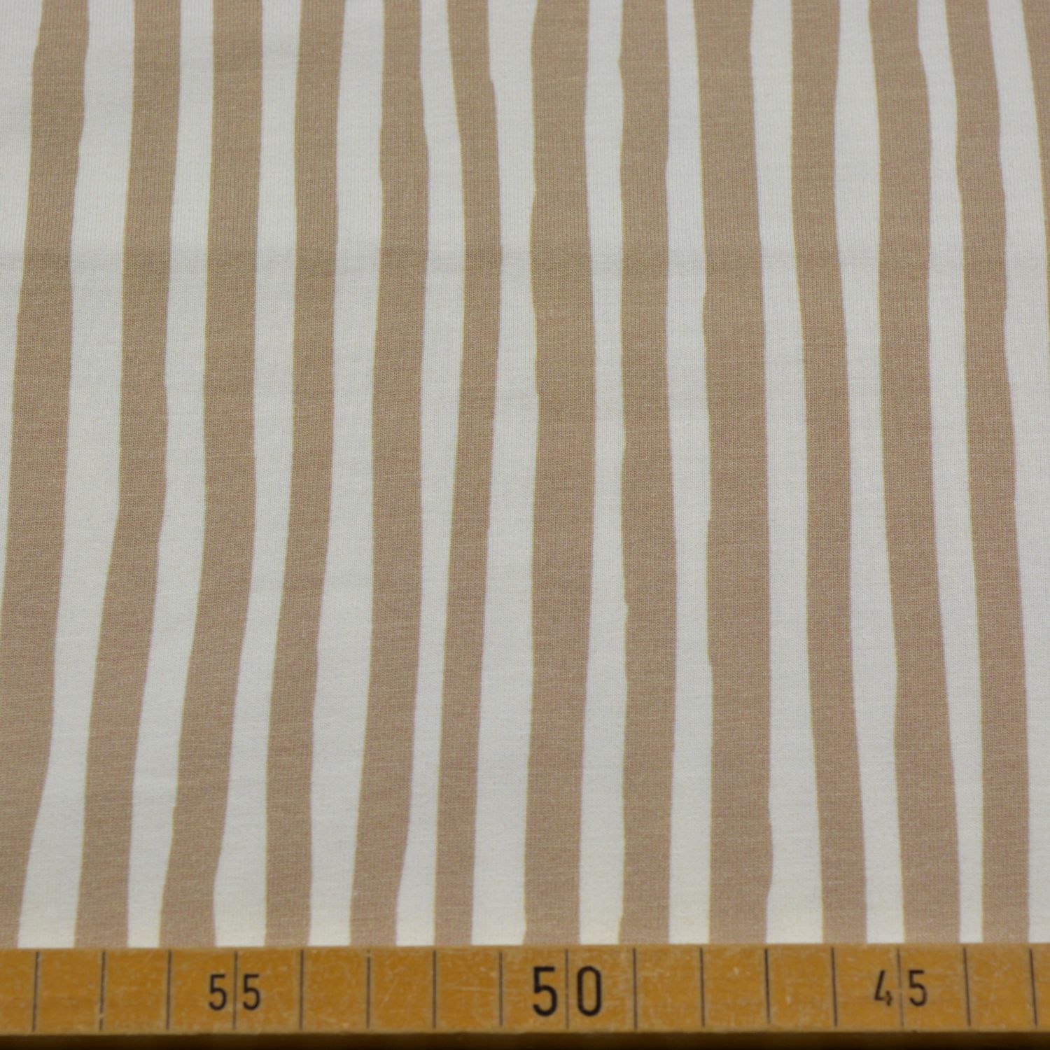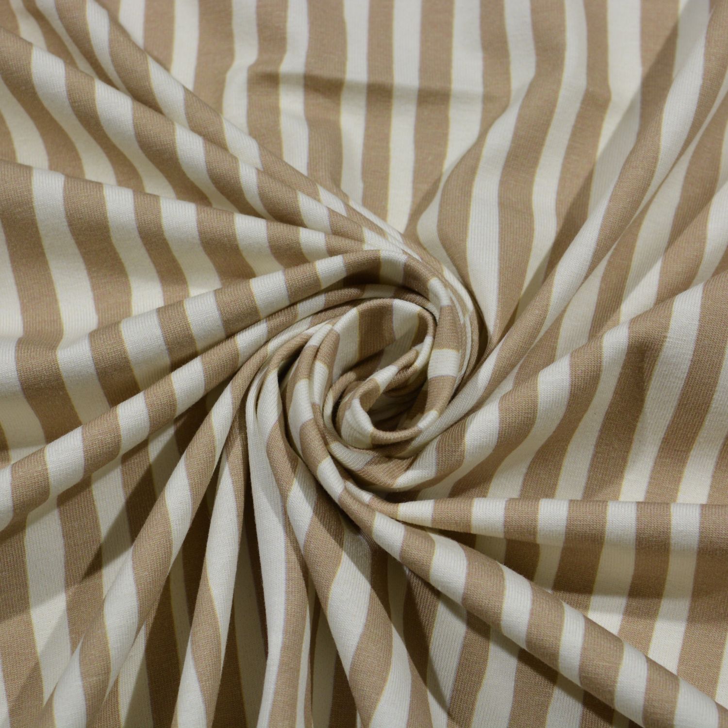 Dieser hochwertige Baumwoll-Jersey überzeugt durch seine angenehme Elastizität, den weichen Griff und ein zeitloses Streifen-Design in Natur- und Beigetönen. Durch den Elasthan-Anteil ist der Stoff formstabil, dehnbar und besonders komfortabel zu tragen. Mit einem Gewicht von ca. 200 g/m² eignet sich der Jersey ideal für Bekleidungsprojekte mit etwas mehr Stand, ohne dabei an Bewegungsfreiheit zu verlieren.