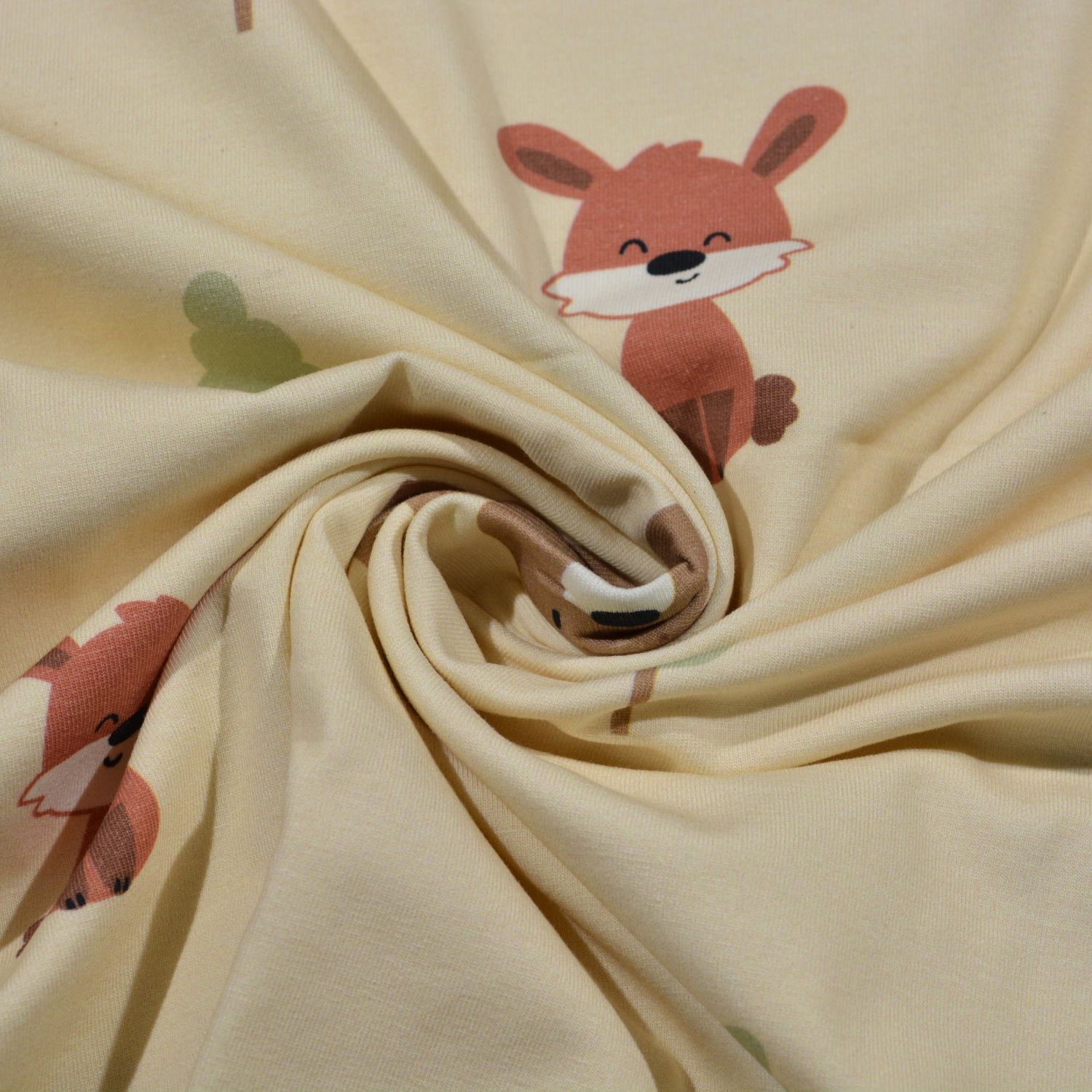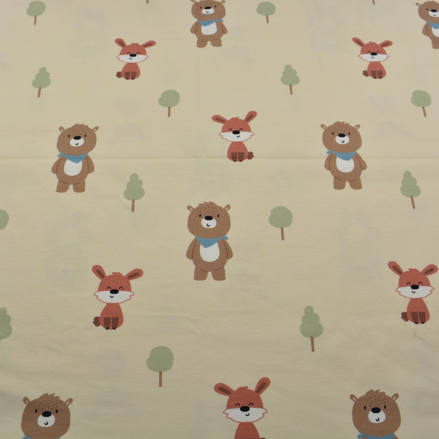 Dieser hochwertige Baumwolljersey überzeugt durch ein kindgerechtes, liebevoll gestaltetes Motiv mit Bären, Füchsen und kleinen Bäumen auf hellem Untergrund. Der Stoff ist angenehm weich, elastisch und hautfreundlich – ideal für bequeme und alltagstaugliche Nähprojekte. Durch seine elastischen Eigenschaften eignet er sich hervorragend für Kleidung mit hohem Tragekomfort.