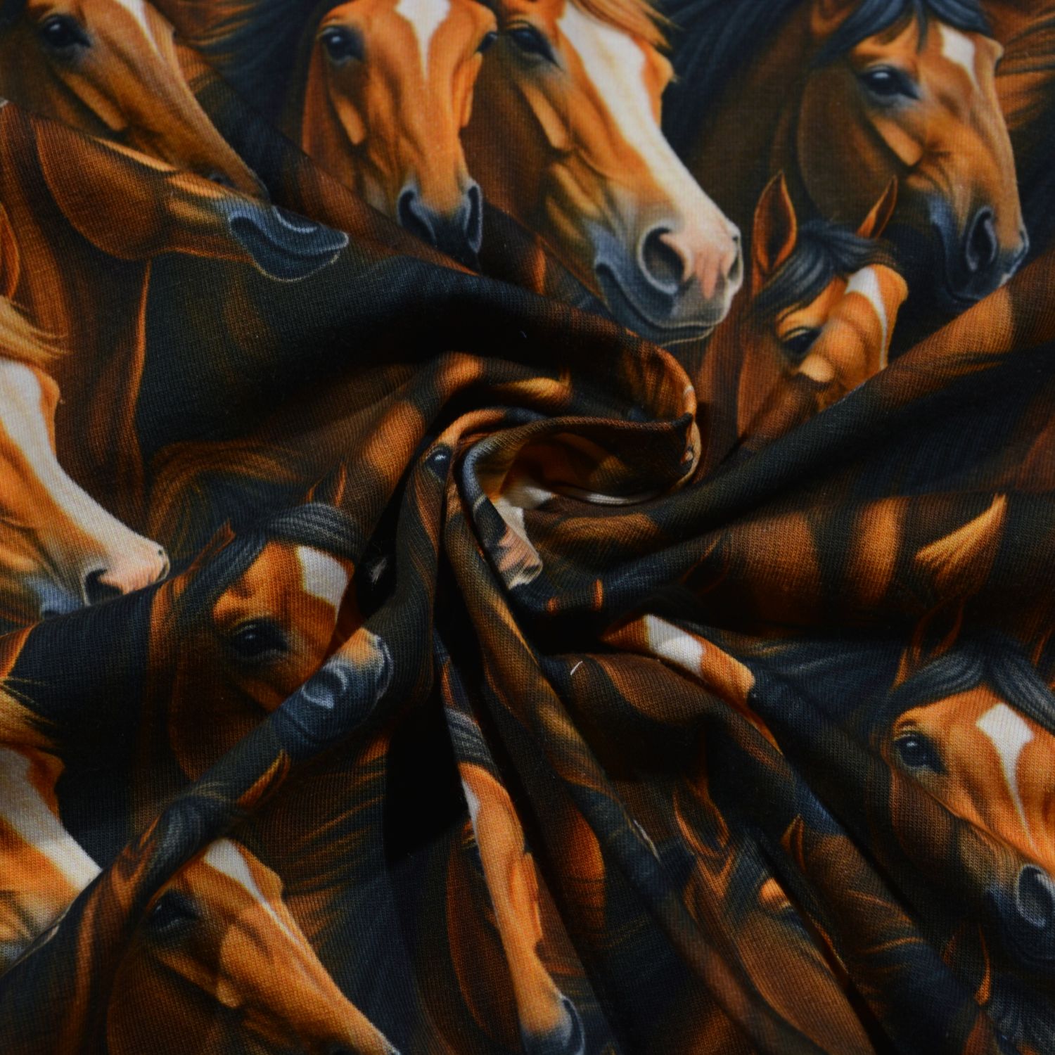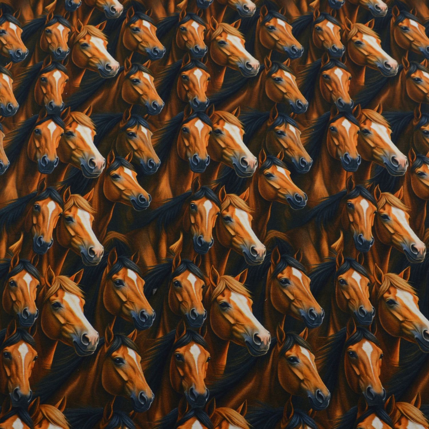 Dieser hochwertige Baumwolljersey begeistert mit einem detailreichen Pferde-Design in natürlichen Brauntönen. Die realistisch dargestellten Pferdeköpfe sind dicht angeordnet und wirken durch ihre feinen Schattierungen besonders lebendig und ausdrucksstark. Der dunkle Hintergrund hebt die warmen Farbtöne der Pferde hervor und verleiht dem Stoff eine edle, kraftvolle Optik.
