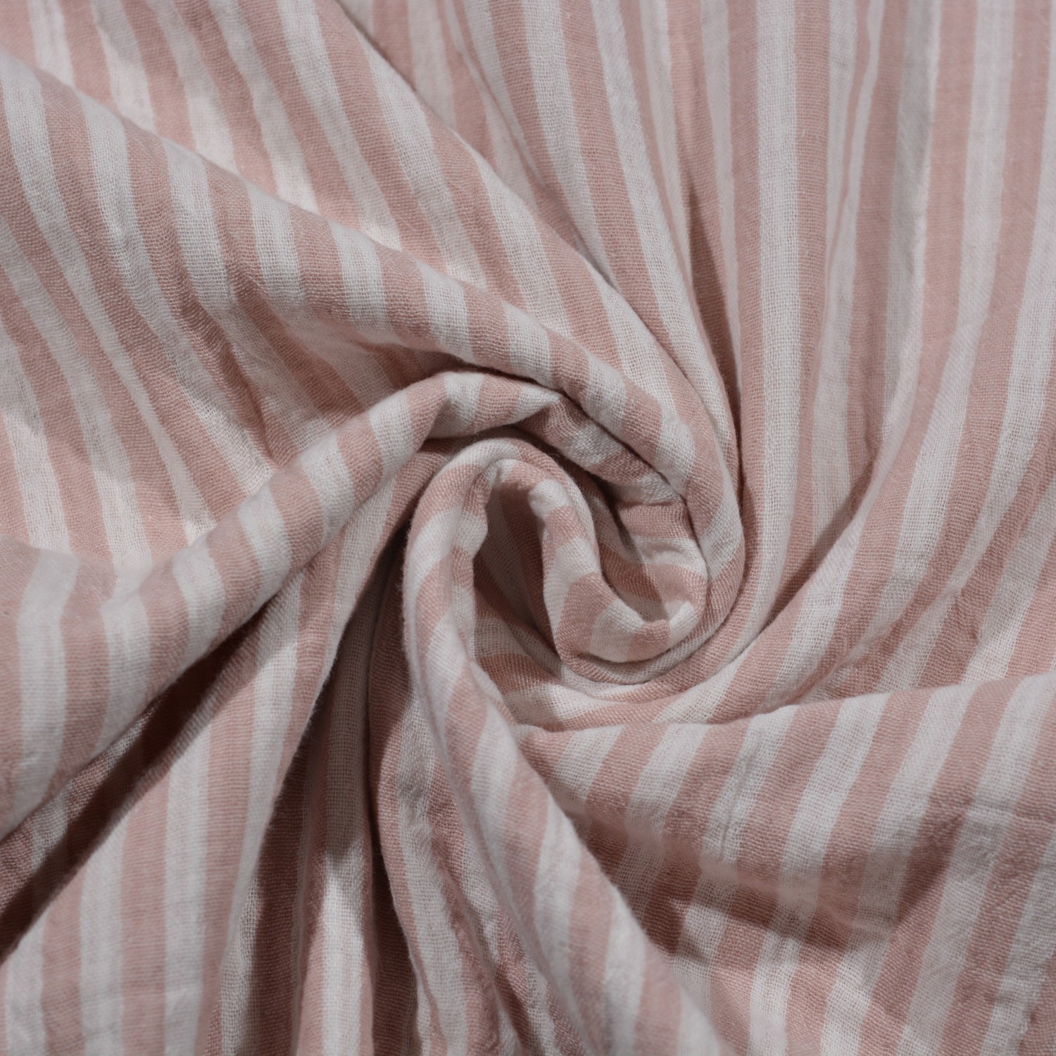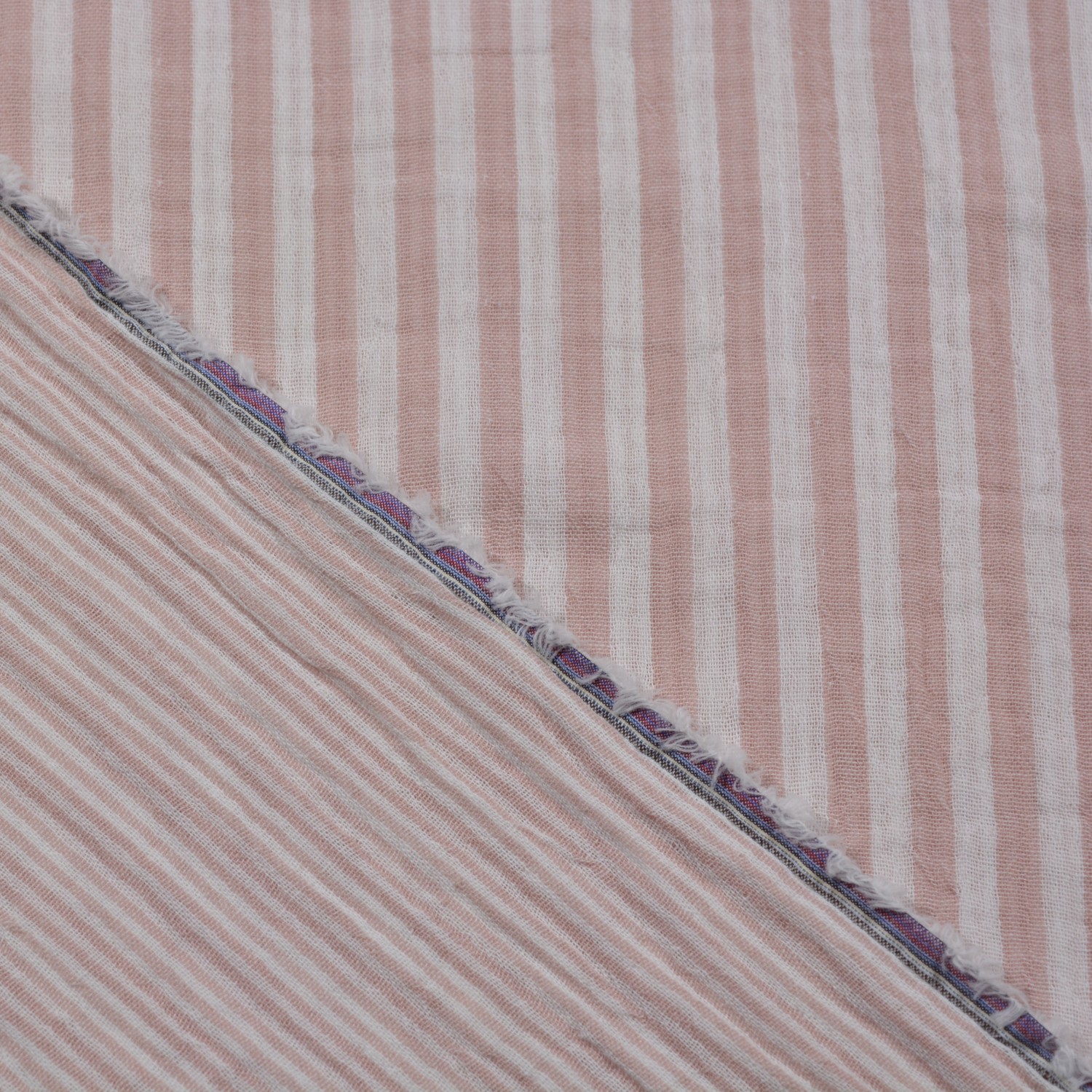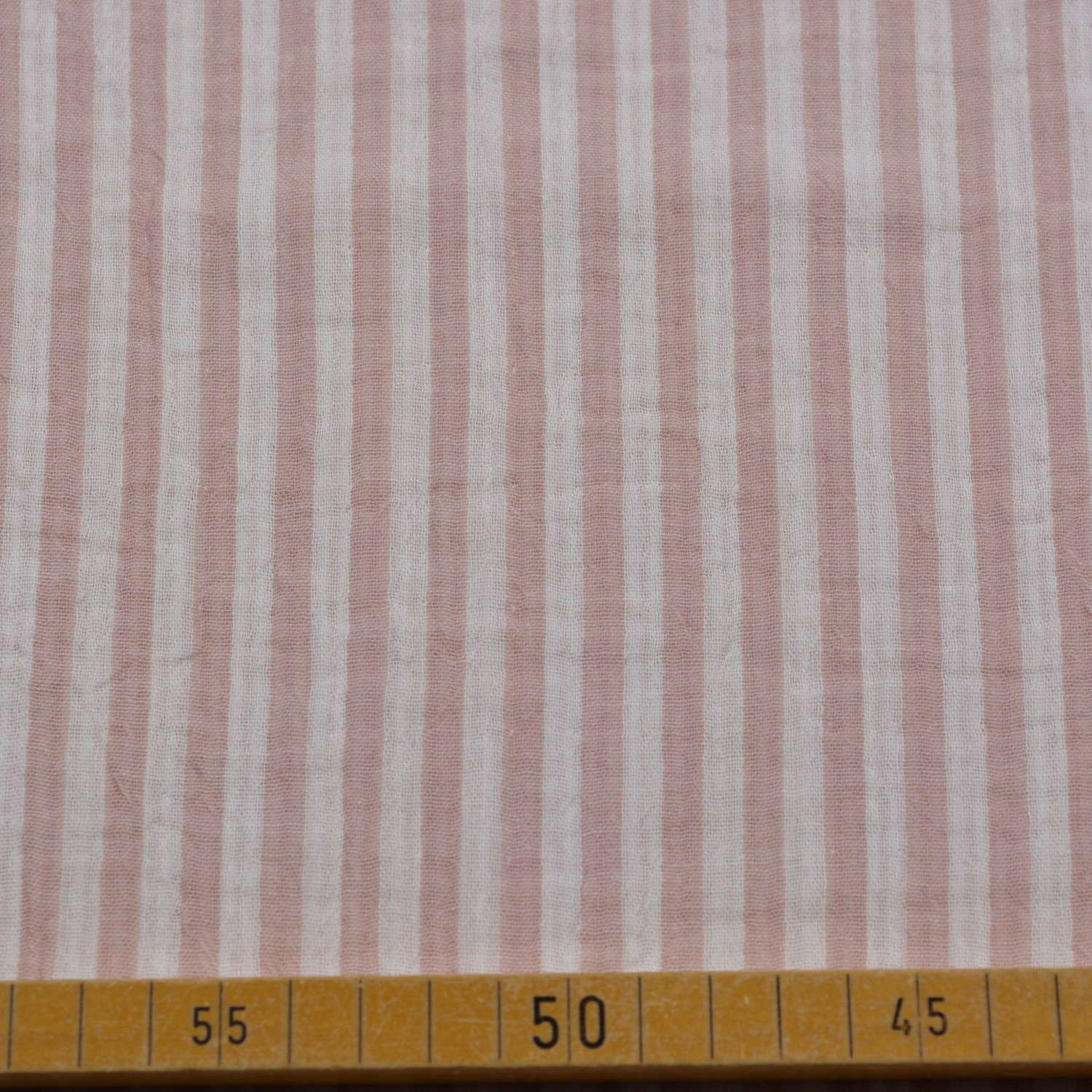 Dieser edle Musselin Doubleface aus 100% Baumwolle besticht durch sein zartes Streifenmuster in Oldrose und Offwhite. Durch die garngefärbte Webung bietet der Stoff eine beidseitige Verwendung mit unterschiedlich breiten Streifen auf Vorder- und Rückseite. Seine weiche, luftige Struktur macht ihn ideal für Blusen, Sommerkleidung, Halstücher, Babyartikel oder Heimtextilien.