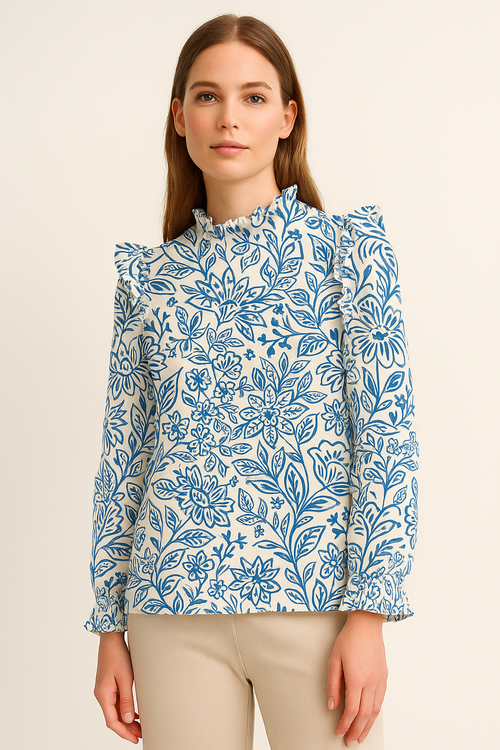 Der Musselin „Maribel“ bringt frische Eleganz in jedes Nähprojekt. Das leuchtend blaue Blumenmotiv auf cremefarbenem Hintergrund verleiht dem Stoff einen modernen, zugleich zeitlos klassischen Look.