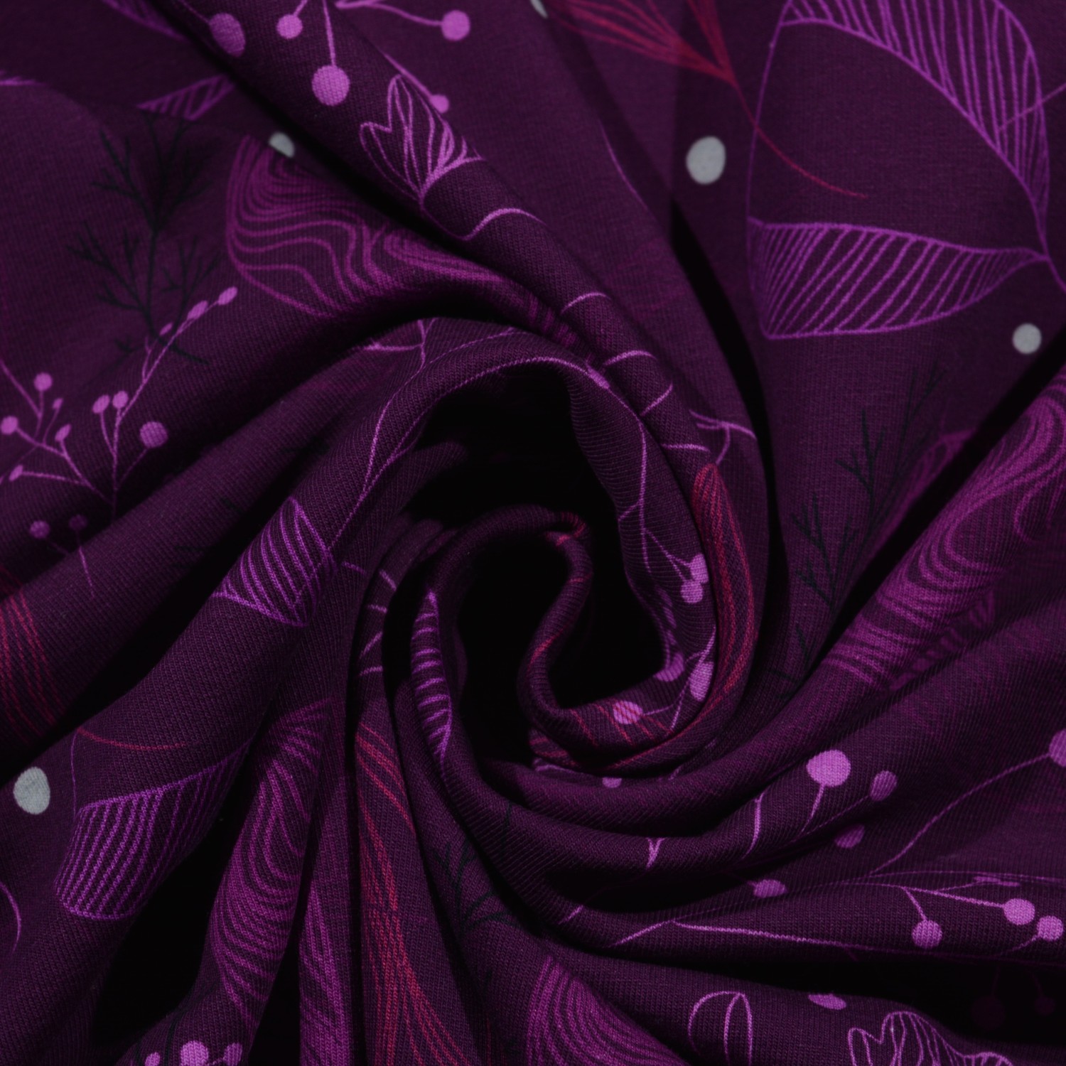 Dieser wunderschöne French Terry besticht durch sein florales Muster in eleganten Bordeaux- und Pinktönen. Der Stoff ist angenehm weich, formstabil und durch den Elasthan-Anteil besonders dehnbar. Mit 250 g/m² ist er ideal für Bekleidung wie Pullover, Hoodies, Kleider, Röcke oder lässige Hosen geeignet.
