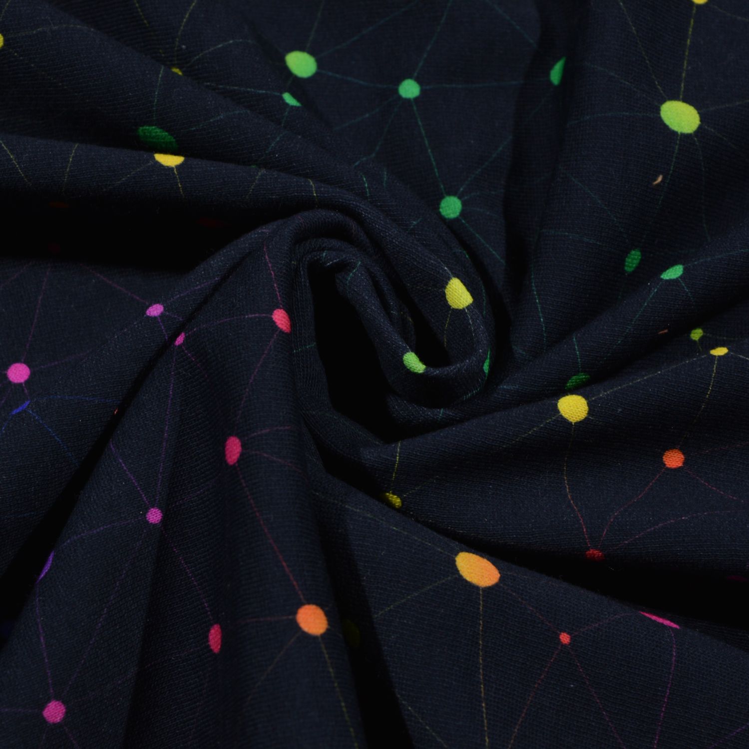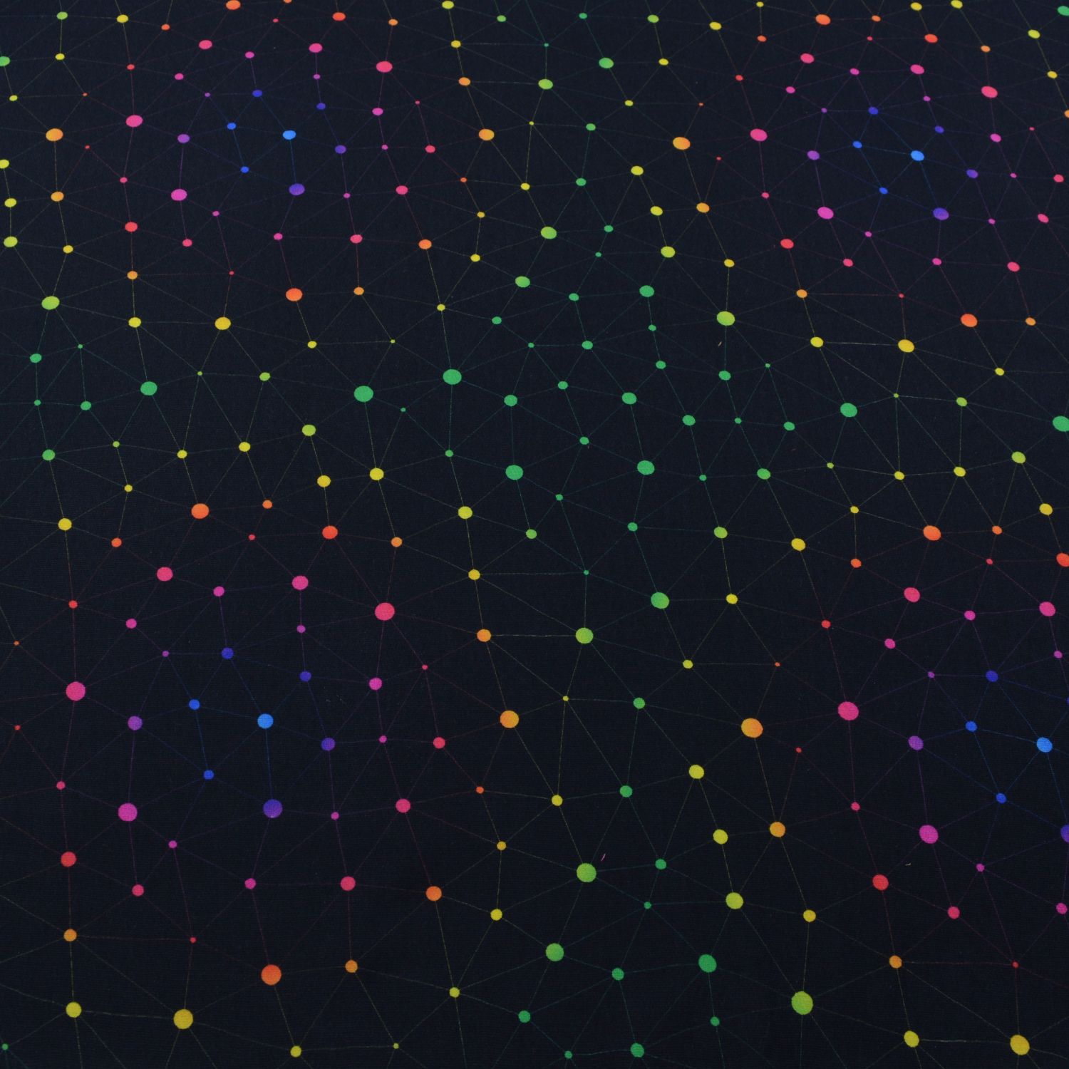 Dieser moderne Sweatstoff überzeugt mit einem auffälligen, grafischen Netzwerk-Design auf tiefschwarzem Hintergrund. Feine Linien verbinden leuchtende Punkte in Neonfarben wie Grün, Gelb, Orange, Pink und Blau und erzeugen eine dynamische, fast digitale Optik. Das Muster erinnert an Netzwerke, Verbindungen oder Sternbilder und verleiht dem Stoff einen zeitgemäßen, urbanen Look.