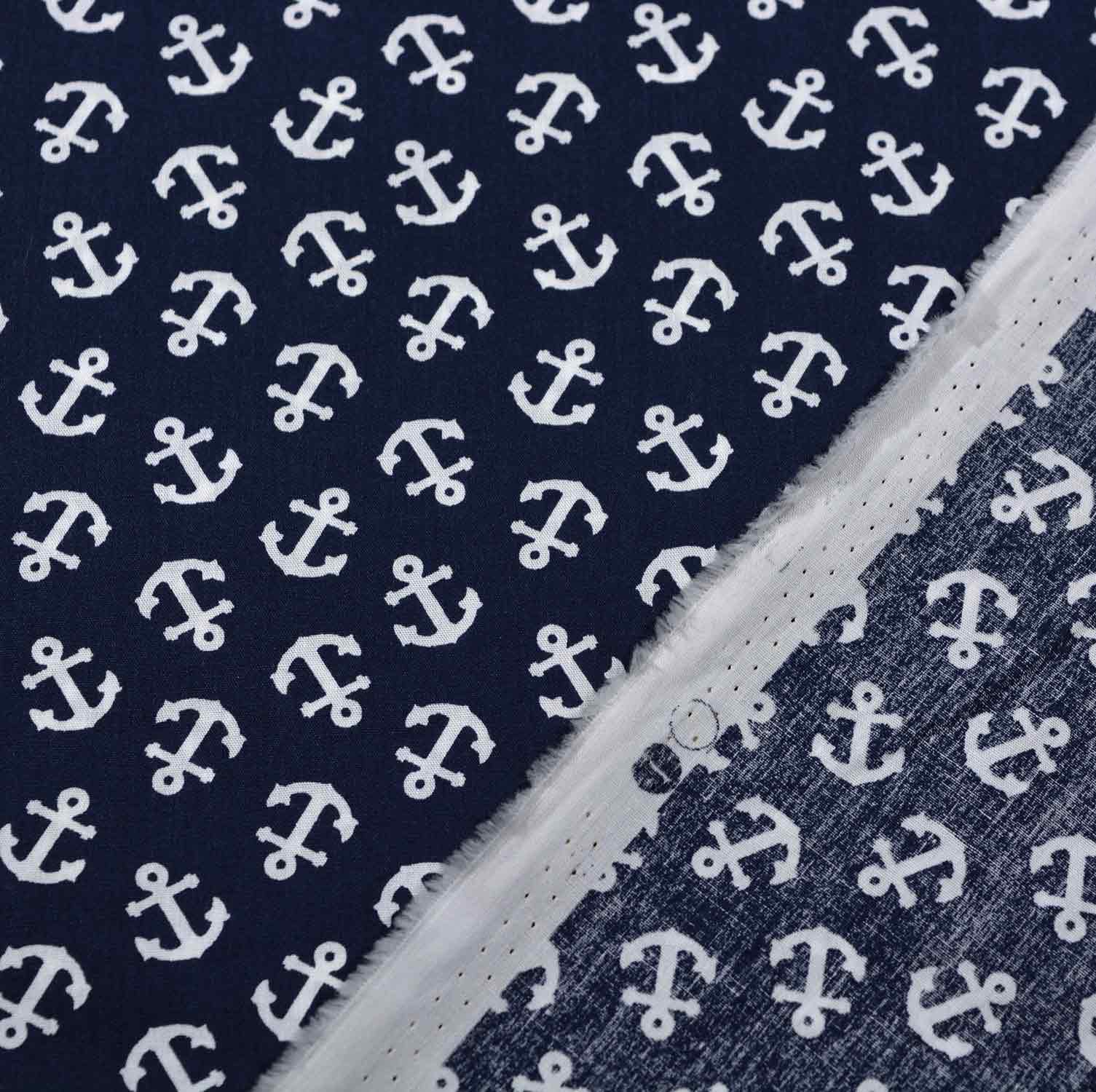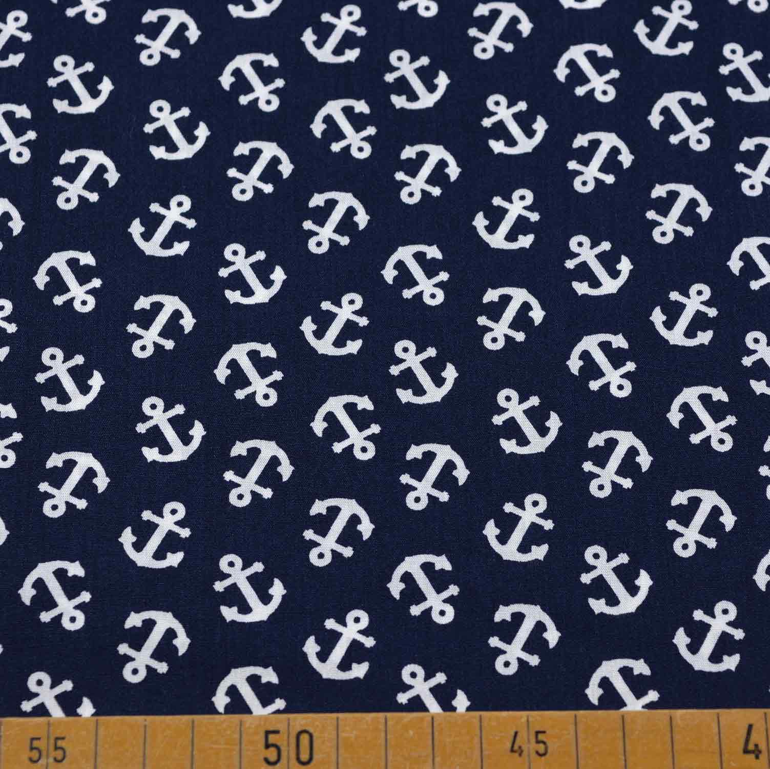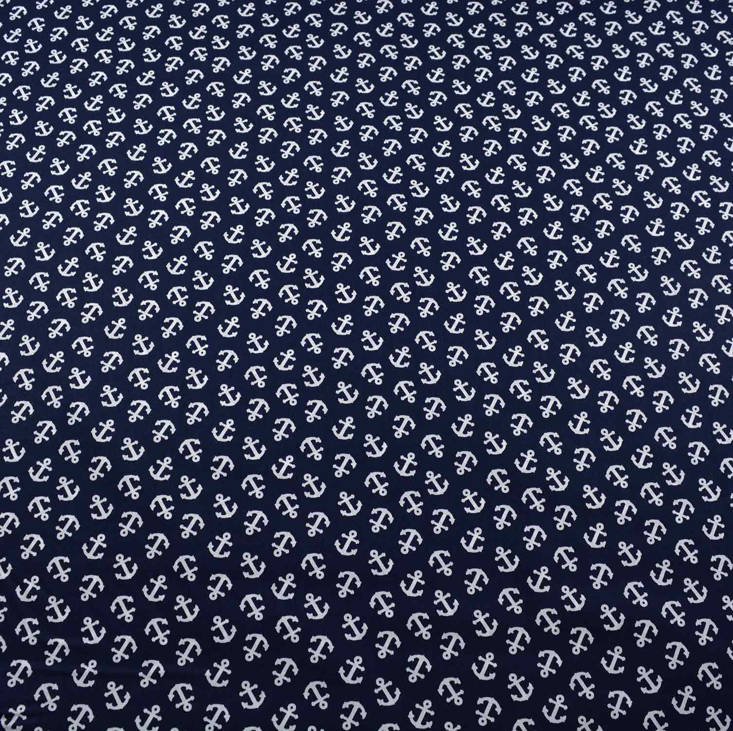 Unser hochwertiger Baumwollstoff ist perfekt für maritime und stilvolle Nähprojekte geeignet. Er besteht zu 100% aus Baumwolle, was ihm eine weiche Haptik und natürliche Atmungsaktivität verleiht. Mit einer Breite von 150 cm und einem Gewicht von 110 g/m² ist er leicht und dennoch strapazierfähig genug für eine Vielzahl von Anwendungen wie Kleidung, Accessoires und Heimtextilien. Das Design zeigt weiße Anker auf einem klassischen marineblauen Hintergrund, was jedem Projekt eine maritime und frische Note verleiht. Dieser Stoff eignet sich besonders gut für maritime Dekorationen, Bekleidung und Accessoires.
