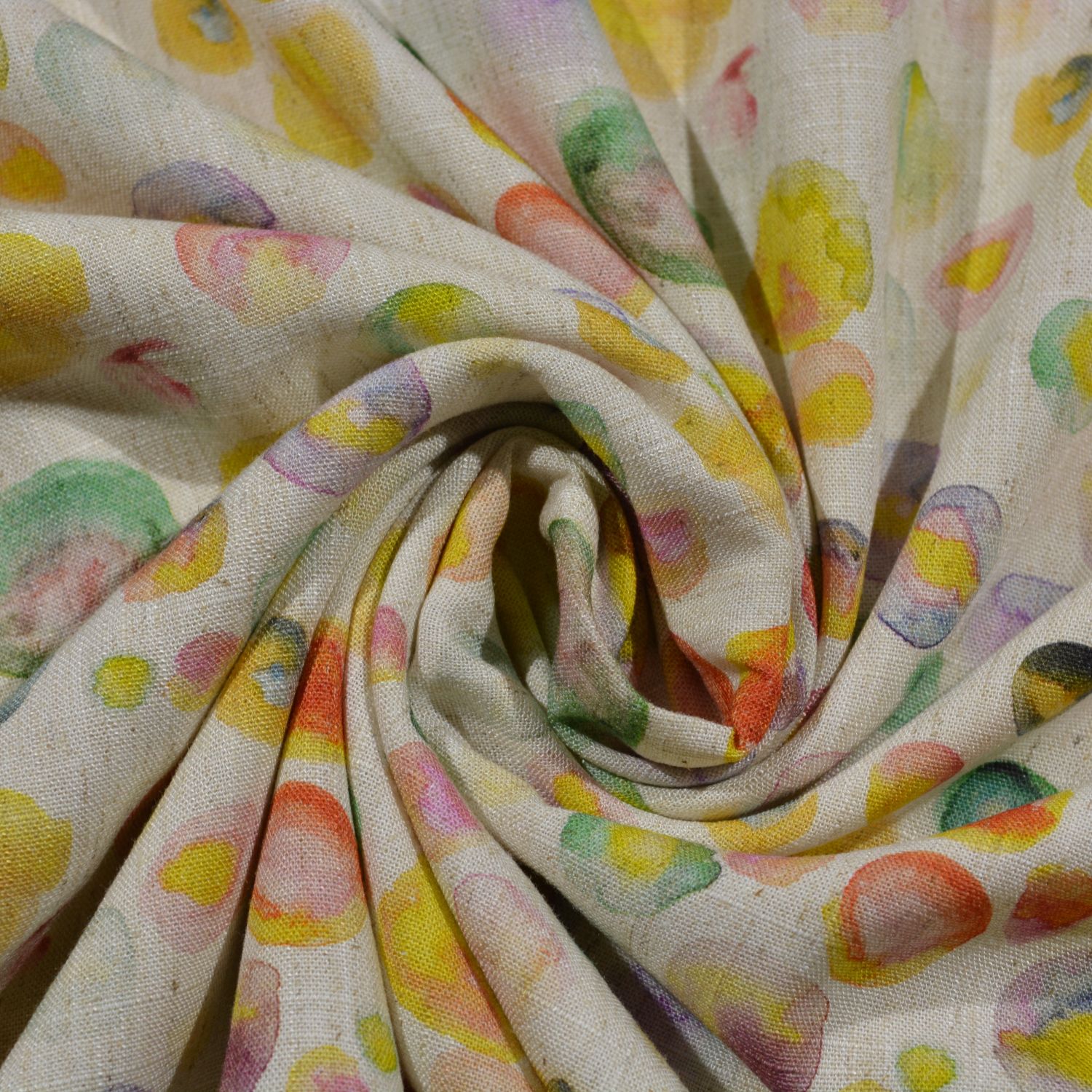 Das lebendige Druckdesign mit aquarellartigen, bunten Punkten verleiht dem Stoff eine frische, kreative Ausstrahlung und eignet sich hervorragend für modische Einzelstücke mit besonderem Charakter.